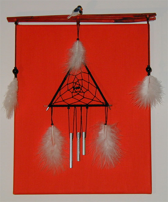 schwarzer Dreamcatcher mit 3 weissen Federn und 3 silbernen Klangstäben