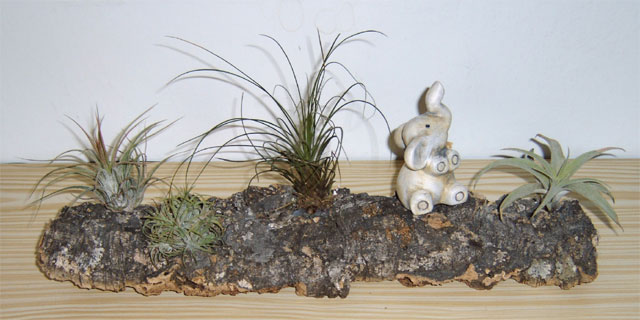 Wurzel mit vier verschiedenen Tillandsien und Terracotta-Elefant Grösse: ca. 40 cm Preis: 35 Euro Kein Versand möglich! Lieferung auf Anfrage |